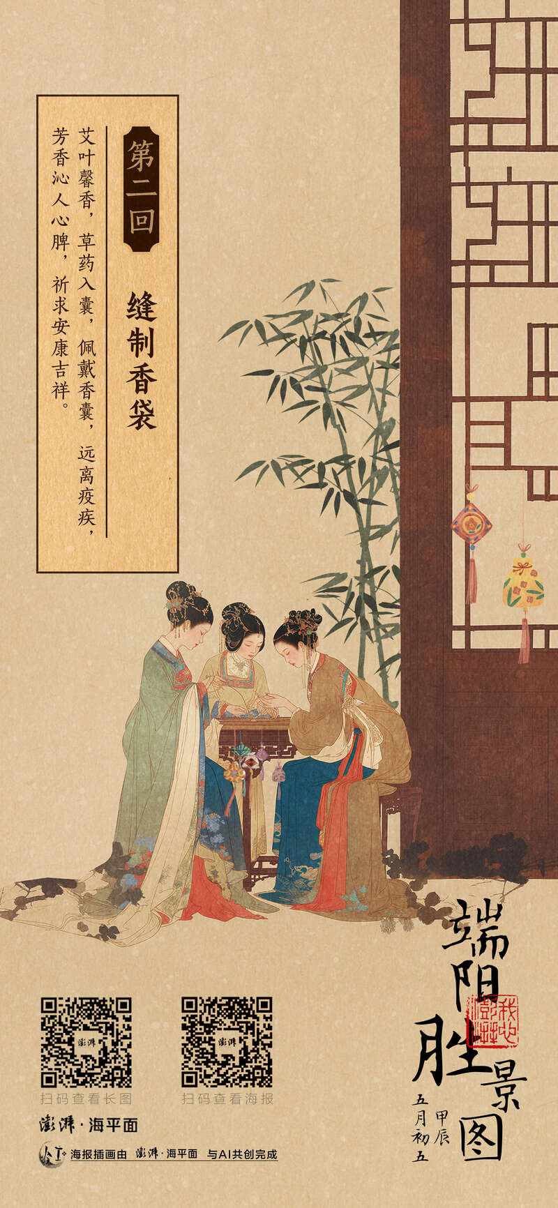 时代变迁,中华文化绽放着新的光彩。我们用 AI 描绘端阳民俗:悬艾草、插菖蒲,做香囊,裹粽,采草药,沐兰汤,系五彩绳,喝雄黄酒,观竞渡......通过人工智能重新演绎民俗风情,诠释古画之美,致敬中华民族传统美学。