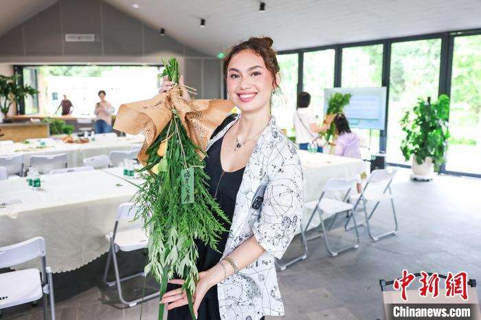 6月10日,汉娜·罗斯展示自己现场制作的菖蒲花束。(主办方供图)