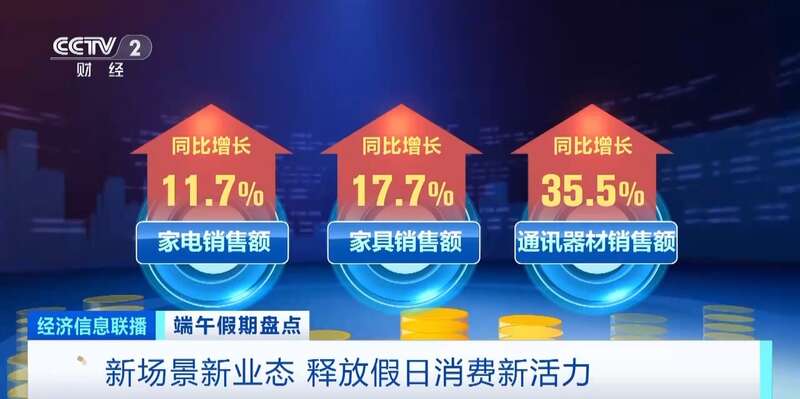 端午假期,商圈消费焕发新活力。商务部商务大数据显示,假期里全国重点零售和餐饮企业销售额比去年同期增长9.8%。全国示范步行街客流量、营业额同比分别增长11.7%和9.2%。家电、家具、通讯器材销售额同比分别增长11.7%、17.7%和35.5%,全国实物商品网上零售额同比增长30%以上。