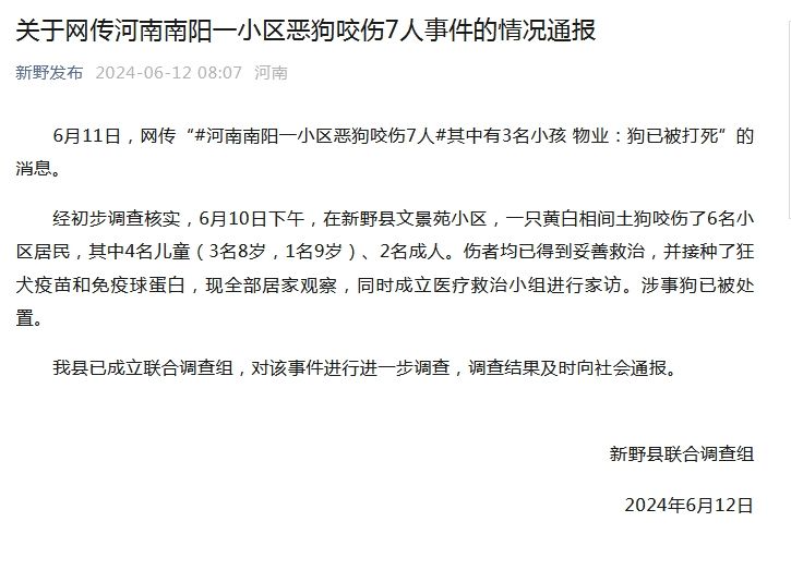 中新网6月12日电 据河南新野县委宣传部微信公众号消息,6月11日,网传“河南南阳一小区恶狗咬伤7人,其中有3名小孩,物业:狗已被打死”的消息。