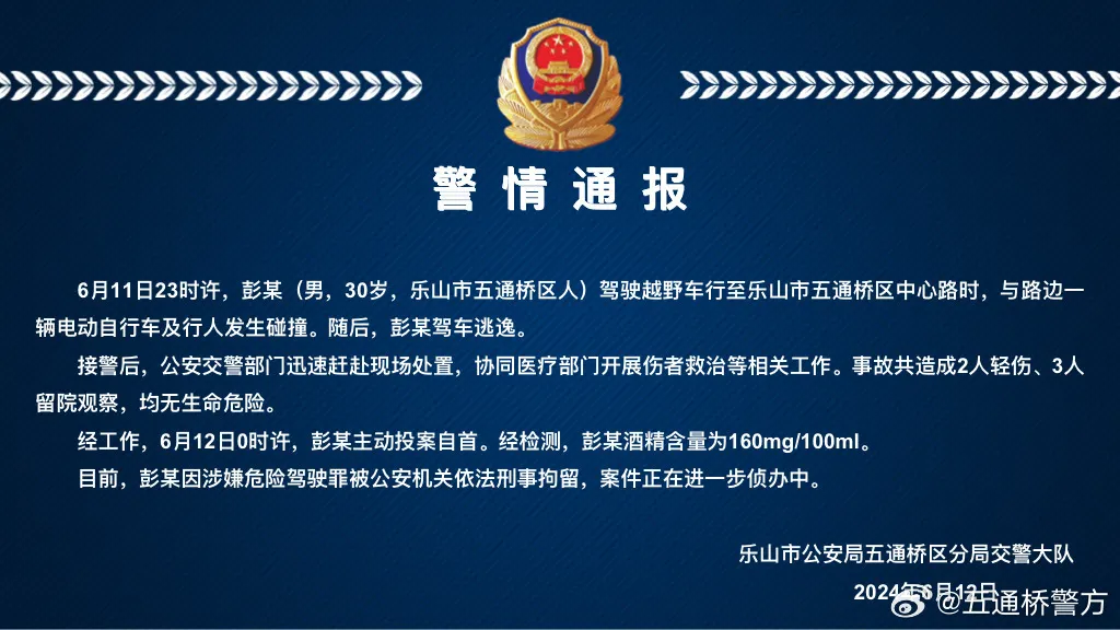 通报称,6月11日23时许,彭某(男,30岁,乐山市五通桥区人)驾驶越野车行至乐山市五通桥区中心路时,与路边一辆电动自行车及行人发生碰撞。随后,彭某驾车逃逸。