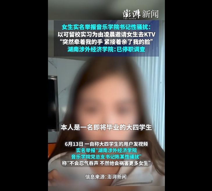 6月13日,一自称大四女生的用户发视频实名举报“被湖南涉外经济学院音乐学院党总支书记陈某性骚扰”,称“不会忍气吞声,不然他会祸害更多女生”。