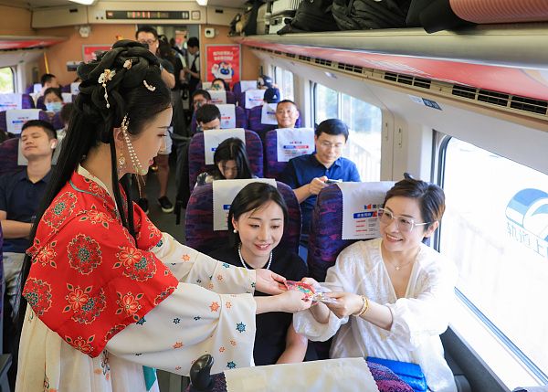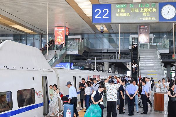 2024年6月15日,旅客在南京南站乘坐长三角环线高铁列车。