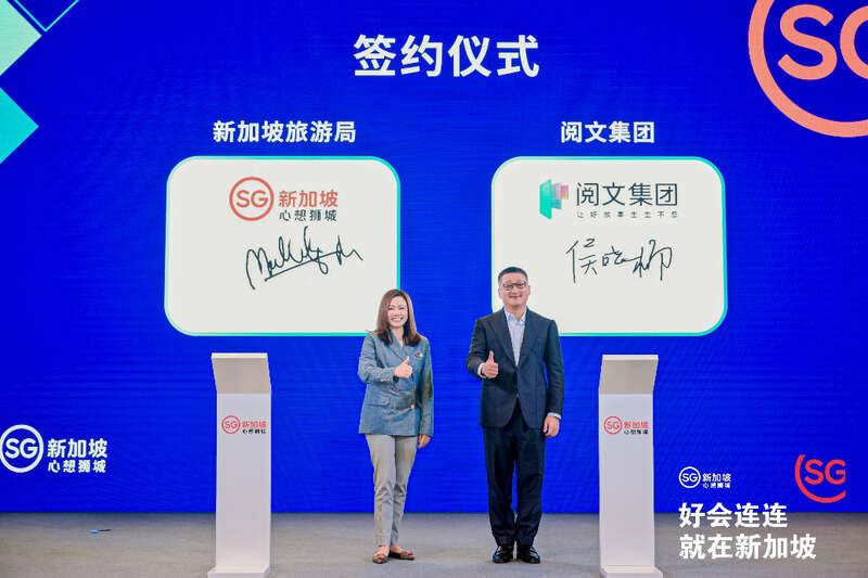 新加坡旅游局局长欧燕媚与阅文集团首席执行官兼总裁侯晓楠出席签约仪式。此次合作,新加坡旅游局将借助新加坡亚洲与全球门户优势,协调本地丰富的旅游、场馆和服务资源,以多元化方式呈现热门华语IP。