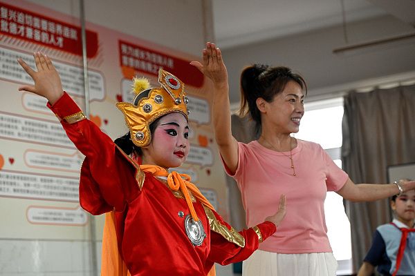 2024年6月14日,河南省洛阳市东升第二小学,戏曲社团的学生在老师的指导下学习戏曲表演动作。