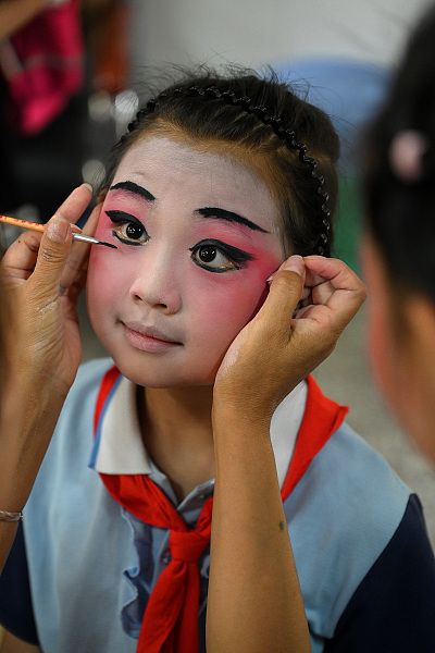 2024年6月14日,河南省洛阳市东升第二小学,戏曲社团的学生化戏妆。