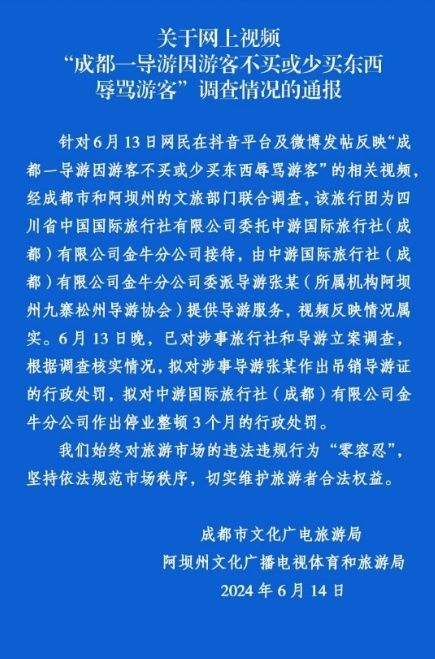 针对6月13日网民在抖音平台及微博发帖反映“成都一导游因游客不买或少买东西辱骂游客”的相关视频,经成都市和阿坝州的文旅部门联合调查,该旅行团为四川省中国国际旅行社有限公司委托中游国际旅行社(成都)有限公司金牛分公司接待,由中游国际旅行社(成都)有限公司金牛分公司委派导游张某(所属机构阿坝州九寨松州导游协会)提供导游服务,视频反映情况属实。6月13日晚,已对涉事旅行社和导游立案调查,根据调查核实情况,拟对涉事导游张某作出吊销导游证的行政处罚,拟对中游国际旅行社(成都)有限公司金牛分公司作出停业整顿3个月的行政处罚。