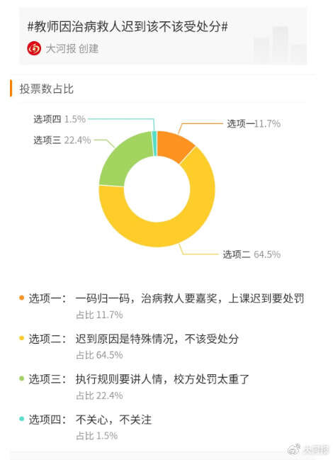 另据@大河报 消息,6月16日,南方医科大学教师因救死扶伤受处分引发热议,不少网友表示教师迟到原因是治病救人,校方不应进行处分。
