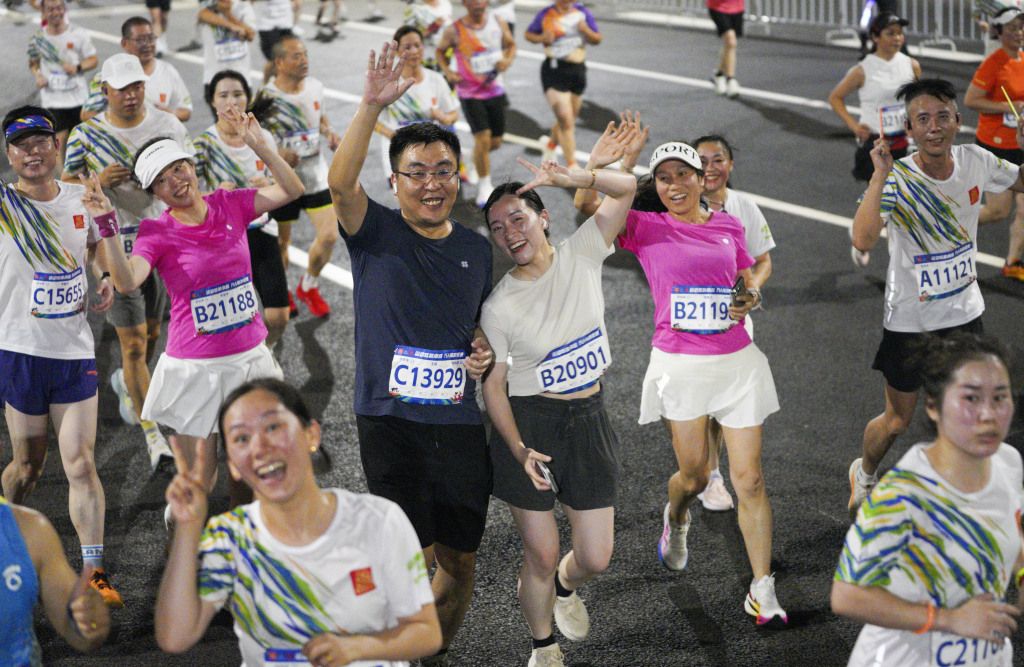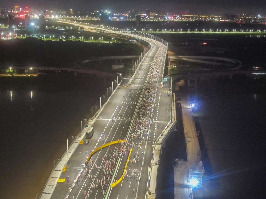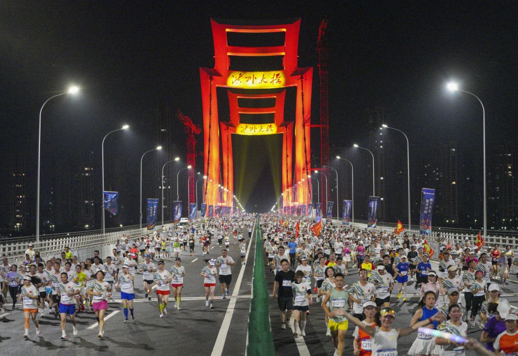 2024年6月15日,南昌市洪州大桥上,选手们正在进行夜跑。