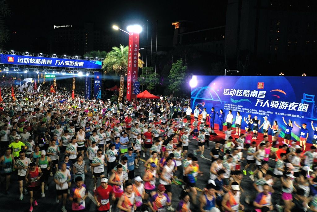 2024年6月15日晚,“运动炫酷南昌 万人骑游夜跑”活动举行。本次活动设置了自行车骑游和夜跑两个项目,全程约13公里,吸引了1.4万余人报名参加,是目前南昌市夜间举办的规模最大的体育赛事活动。活动中,骑友、跑友沿途可近距离观赏洪州大桥、复兴大桥以及南昌一江两岸美丽夜景。图为跑友从起点出发。(无人机照片) 中新社记者 刘占昆 摄