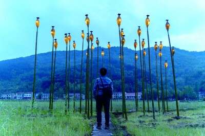展厅一隅,艺术家鲁杨的装置作品《竹灯》成组摆放,如同一片点亮的芦苇荡,让人感受到来自乡土的诗情画意。这件来自“草堆部落艺术季”的作品,其创作灵感源于湖北省黄梅县村民在洗土豆时常用的竹篓,艺术家希望通过这样一件让外来者充满好奇、让本地人感到亲切的日用品,体现当地村民就地取材、因地制宜的文化精神,同时展现人与人、人与环境之间的关联。