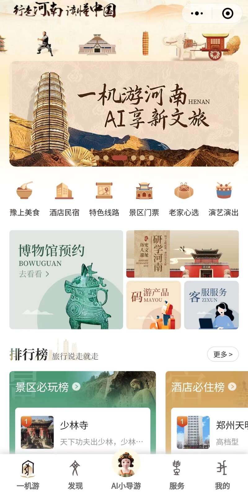 “一机游河南”平台针对游客入豫提供全方位、有权威、高品质、多元化的文旅产品,后续还将持续丰富平台产品和服务,打造惠民、便民的河南文旅产品和服务总入口;以AI技术、大数据赋能,打造智慧新文旅,让旅游体验更加便捷美好。