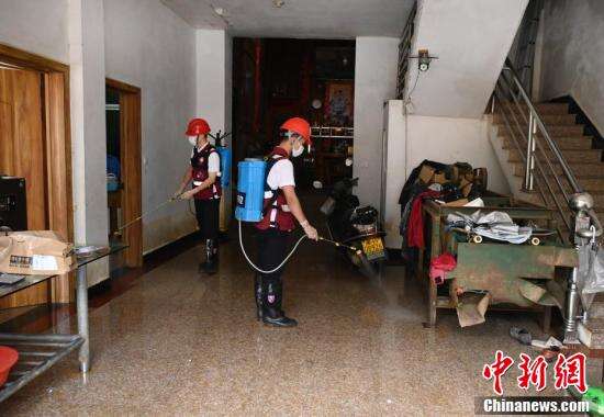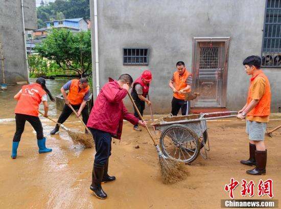 6月17日,在福建省南平市政和县东平镇范屯村,政和县民兵应急分队在清理淤泥和杂物。连日来,强降雨落区在福建省来回摆动,龙岩市武平县等地遭遇破历史极值纪录的降雨,龙岩、南平、三明、宁德等市出现不同程度灾情险情,造成多人死亡、失踪。