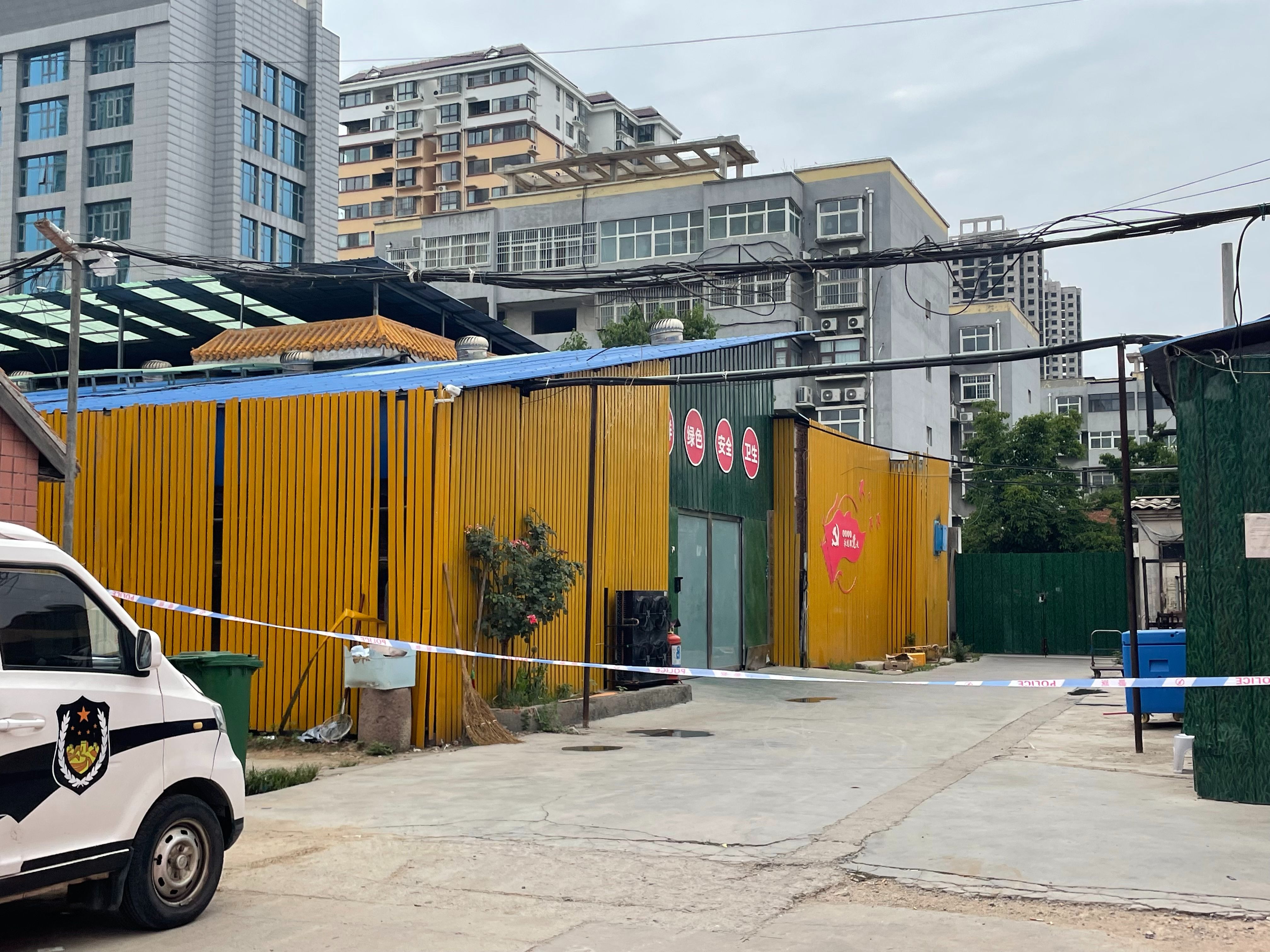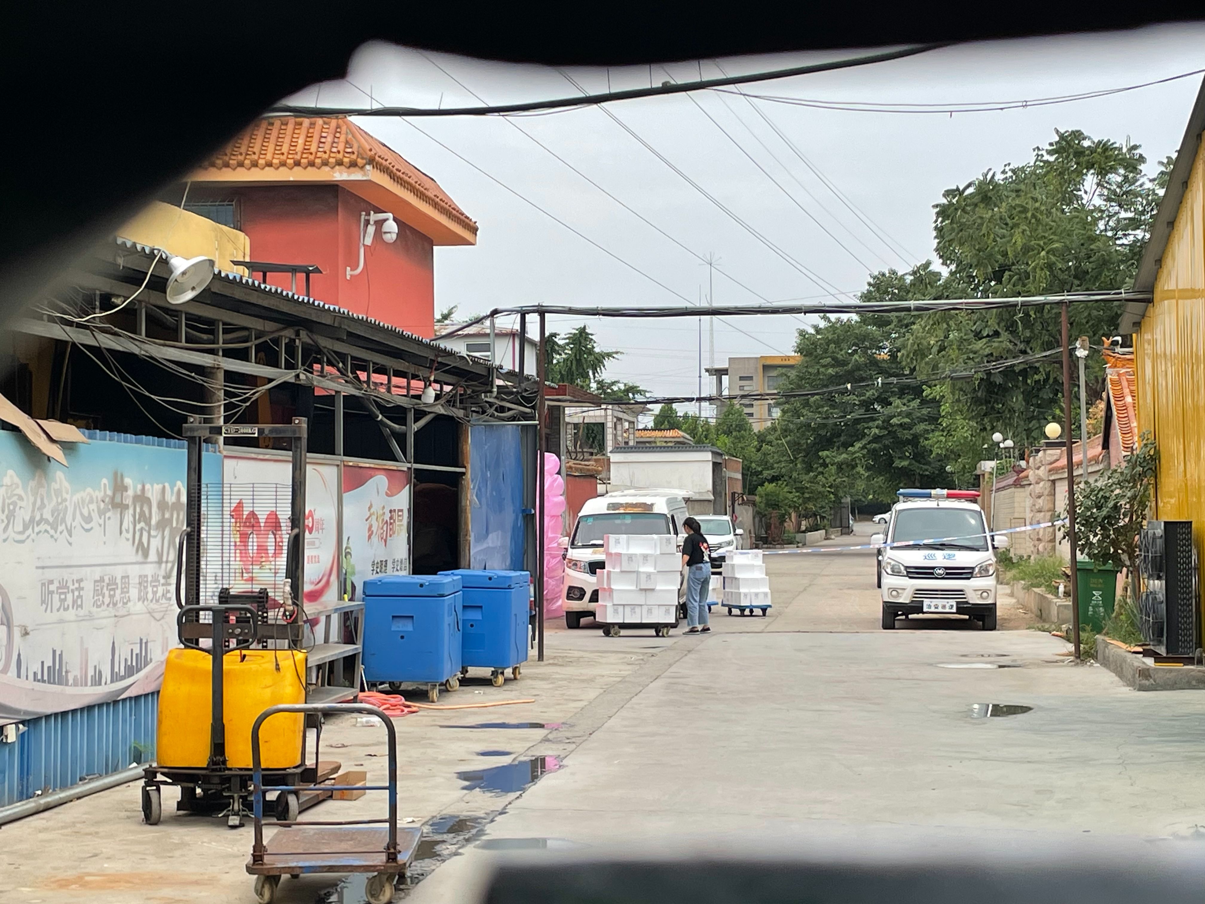 该地址门店和厂房正门紧闭,另一端的入口拉上了警戒线。但厂房仍有机器运作,发出声响,有两人出入搬运货物。警戒线附近放置着许多白色泡沫箱。