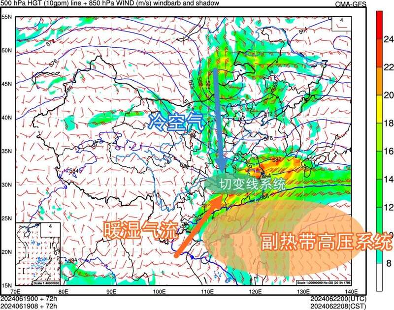 20日开始,副热带高压系统(下文简称副高)开始北抬,控制华南地区及江南南部一带;