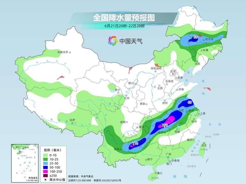 21日开始,北方还有高空槽发展为冷涡并持续东移,它不仅给北方地区带来降水,同时也引导弱冷空气南下,冷暖空气交汇,将在江南北部、江淮一带上空形成低空切变线系统,形成典型的梅雨降水形势,并持续制造强降雨。