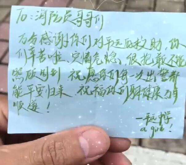 “消防员哥哥们,万分感谢你们对平远的救助,你们辛苦啦……”6月18日,在广东梅州,一位学生给消防员送上一张暖心的字条,简短的话语就是救援一线最好的“礼物”。