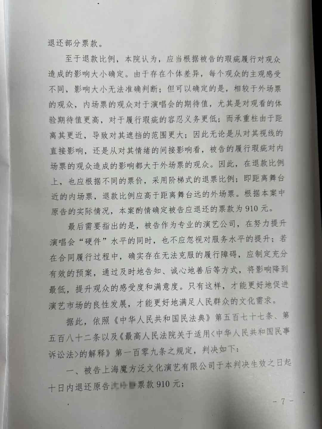关于被告是否构成违约及承担何种违约责任的争议,法院认为,原告的观看视线受到承重柱的明显遮挡,尤其是在舞台中心位置的升降台,本是歌手表演的主舞台,遮挡却最为严重。诚然,受舞台条件限制,观众视线不可能全程无死角,但该遮挡情况显然已经超出原告可预见的范围,导致观看体验未达到普通观众的一般心理预期。被告虽称原告可以通过大屏幕观看歌手表演,但大屏幕都设置在舞台正面,而原告的座位在舞台对角线上,原告从侧面观看大屏幕体验亦不佳。更何况原告观看演唱会的体验不仅在现场的观看,还包括对现场的记录和分享等,这显然是原告仅通过大屏幕观看无法弥补的。在此情况下,被告既没有提前主动告知原告其座位视线被遮挡,给予原告充分的知情权和选择权,也没能制定充分的预案,在现场主动为原告调换座位,消除不利影响。