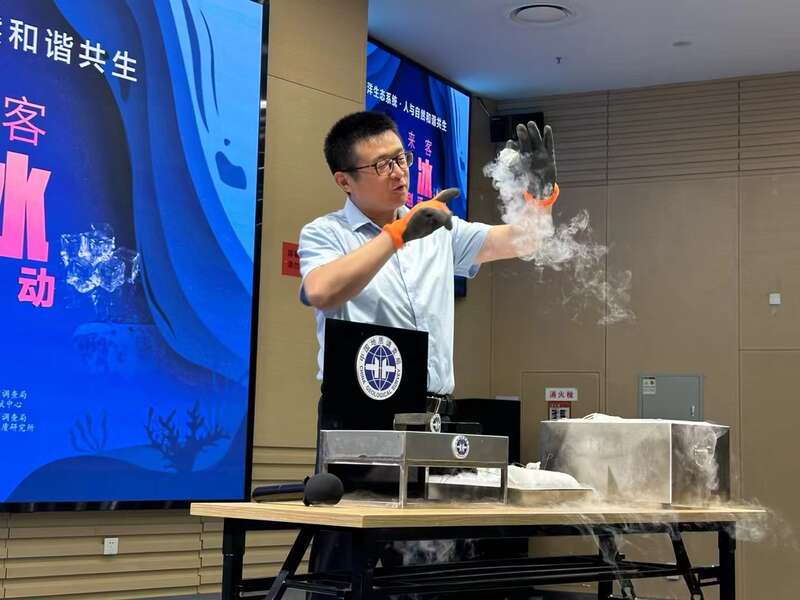 前不久,北京科学中心在举办世界海洋日特别活动时,就呈现了这样的一幕。中国地质调查局青岛海洋地质研究所的正高级工程师孟庆国,将一个白色“冰块”从零下196℃的液氮中取出,随即点燃,而后白色的“冰块”迅速被火焰包裹,燃烧产生的水清晰可见地流下。