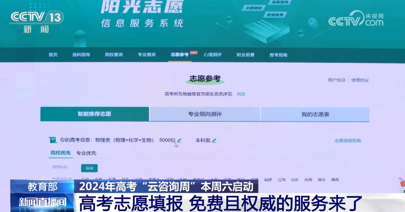 教育部表示,2024年高考“云咨询周”活动期间,教育部“阳光高考信息平台”将提供文字问答和视频直播两种方式,文字问答咨询时间为9时至17时,鼓励高校积极采用视频直播方式开展招生宣传和咨询。各高校将加强线上招生宣传,为考生、家长提供准确权威、周到细致的志愿填报咨询指导和服务。