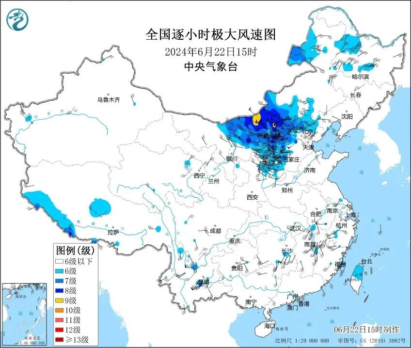 在东北冷涡后部,气旋大风卷起黄沙,在高空向下游传播。从今天下午的大风实况可以看到,内蒙古中部等地普遍出现7级以上大风,局地阵风达9级,风向基本是偏西风为主,利于大风裹挟沙尘东移。