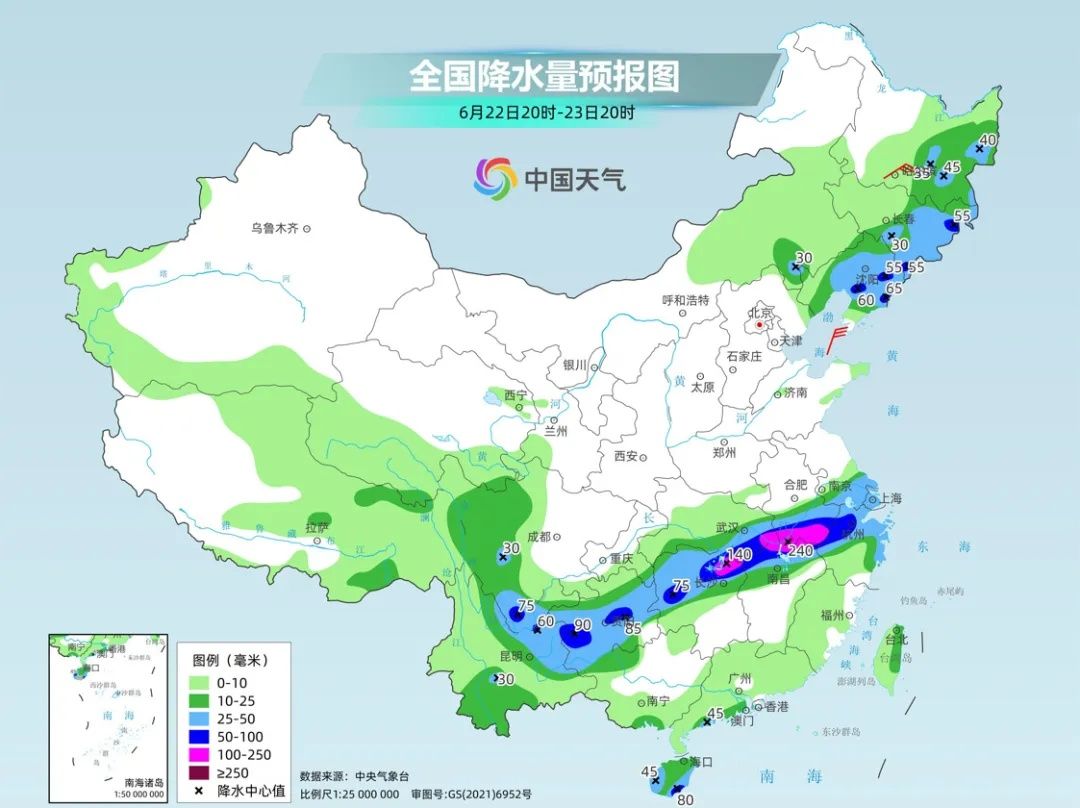 预计未来三天,湖北东南部、湖南北部、安徽南部、江西北部等局地有250~400毫米,日雨量或累计雨量可能突破6月极值;上述部分地区伴有短时强降水、8~10级雷暴大风或冰雹等强对流天气,最大风力达11级以上。