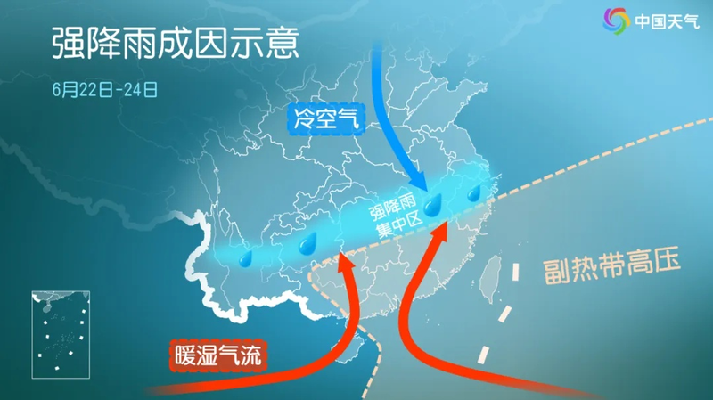 未来三天,随着冷涡后部甩出的冷空气继续南下,与副热带高压系统(下文简称副高)西侧和北侧边缘的西南暖湿气流相遇,这“教科书”级别的梅雨锋还将维持。同时,由于冷涡和副高势均力敌,冷暖激烈交锋容易形成强降雨和强对流,相互拉扯下,因此降雨带位置虽然略有南压,但是总体变化不大,相对稳定维持在贵州到江南北部一带。
