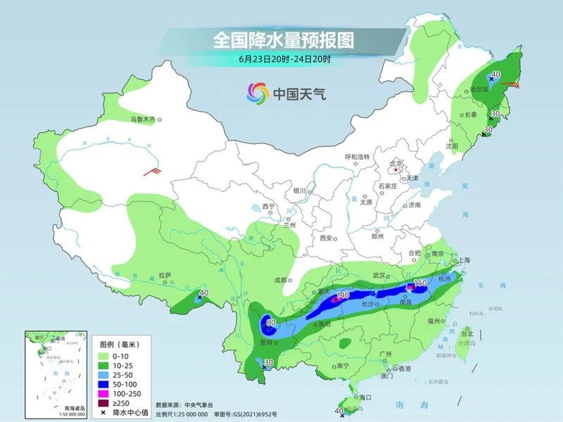 后天(24日),贵州至江南北部仍有大到暴雨,由于南海低值系统进一步发展,华南的降雨也会开始增多,广西西部和南部沿海、海南岛南部等部分地区将有中到大雨。