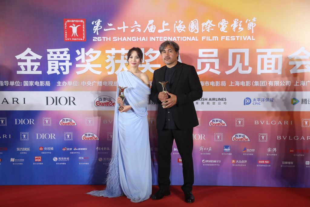 第26届上海国际电影节金爵奖颁奖典礼在上海大剧院举行。哈萨克斯坦影片《离婚》获得最佳影片、最佳女演员两项大奖。图为导演与女演员合影。中新社记者 张亨伟摄