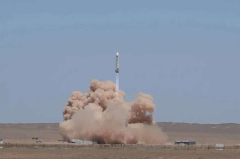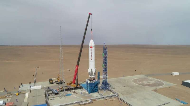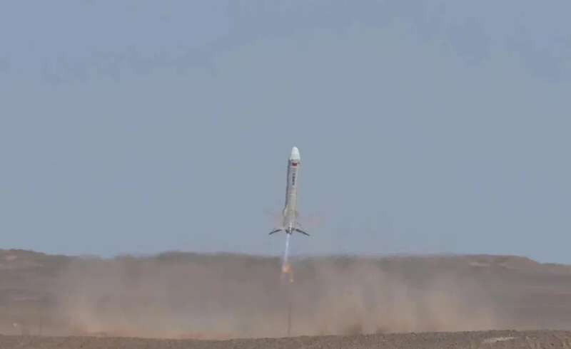下午1时许,在酒泉卫星发射中心,3.8米直径的重复使用运载火箭新技术验证箭竖立在场坪发射台上,3台变推液氧甲烷发动机点火,喷出蓝色尾焰,箭体上升至约12公里高度,中心发动机调节推力,火箭受控下降,在距离地面50米处,四条着陆腿展开,随后火箭缓速下降,高度趋近于零,稳稳落在回收场坪,实现定点垂直软着陆。