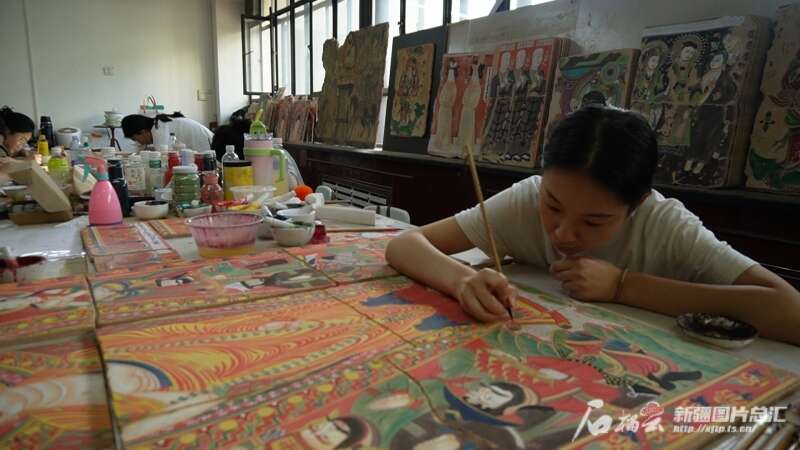 远在千里之外,也有如买买提兄弟般钟情龟兹艺术的人。在乌鲁木齐职业大学的罗皋毅工艺美术技能大师工作室里,几名师生正全神贯注地进行泥板制作、起稿、上色、描边等一道道精细工序,工作室中弥漫着专注的氛围。