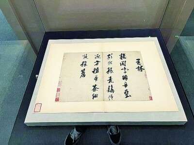 展厅中,“宋四家”真迹迎来了一批批观众。其中,《新岁展庆帖》《人来得书帖》合卷被观众围绕。据考证,二帖是苏轼写给友人陈慥的两封书信,均写于元丰四、五年(1081年—1082年)苏轼被贬黄州期间。二帖笔意自然生动,情致俱佳,是苏轼由早年书法步入中年书法的佳作。