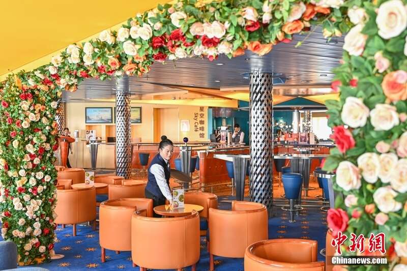 “蓝梦之歌”号邮轮工作人员整理餐厅摆设。
