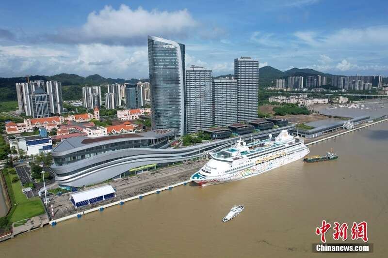 6月25日,“蓝梦之歌”号邮轮从广州南沙国际邮轮母港出发,搭载逾600名海内外旅客前往越南下龙湾,这标志着广州南沙国际邮轮母港正式开港开航。图为“蓝梦之歌”号邮轮停靠在南沙国际邮轮母港等候旅客。(无人机照片)