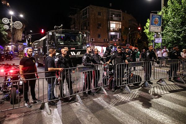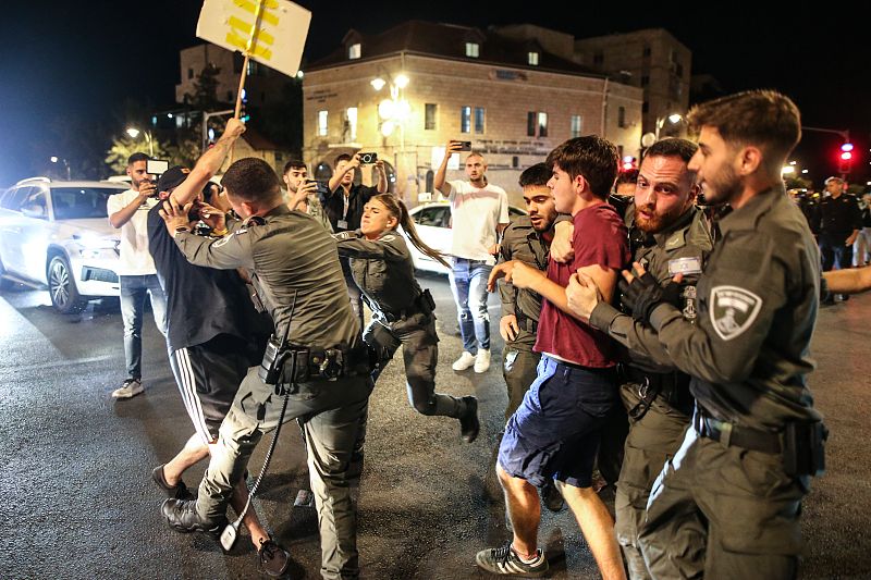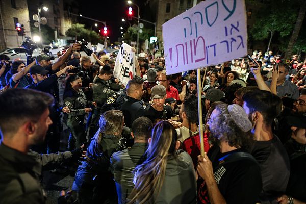 当地时间2024年6月24日,耶路撒冷,以色列人举行示威,要求交换囚犯,并要求总理内塔尼亚胡政府辞职。示威者聚集在美国领事馆外,举着批评内塔尼亚胡政府的横幅、海报和标语牌。该地区的以色列军队采取措施阻止抗议者前进。