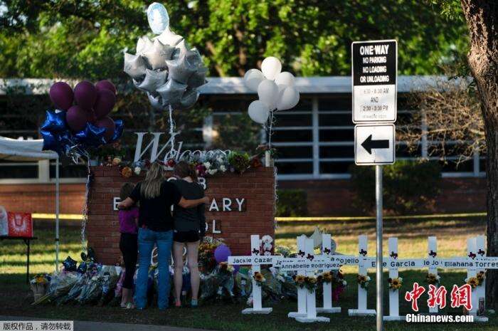 当地时间2022年5月26日,美国得克萨斯州尤瓦尔迪市,民众悼念小学枪击案遇害者。当地一所小学5月24日发生枪击案,造成21人死亡,其中包括19名儿童。