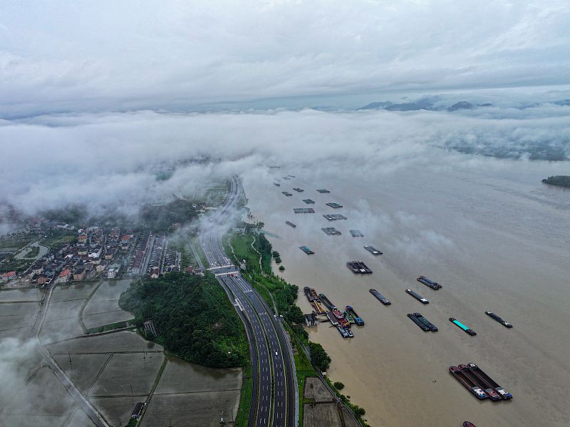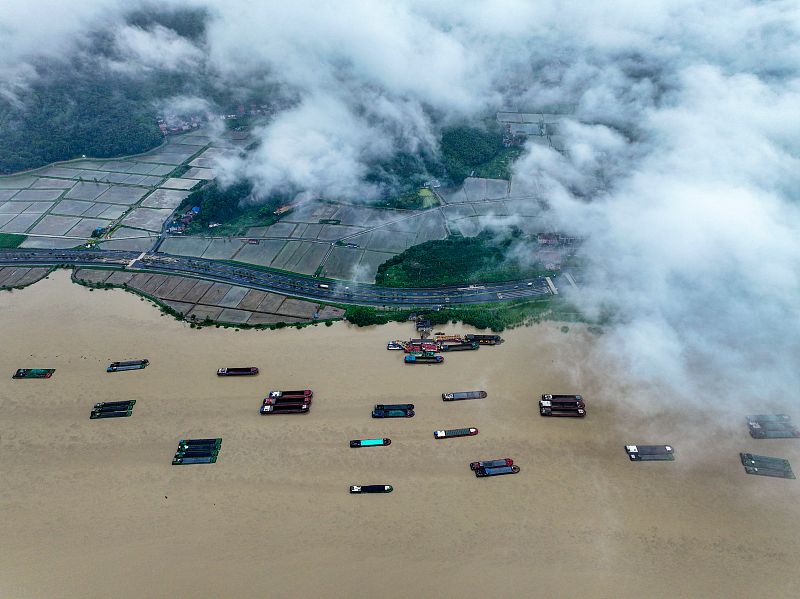 6月26日,杭州富阳区,受钱塘江水位持续上涨、全线封航影响,大批船只停泊在渔山锚地。