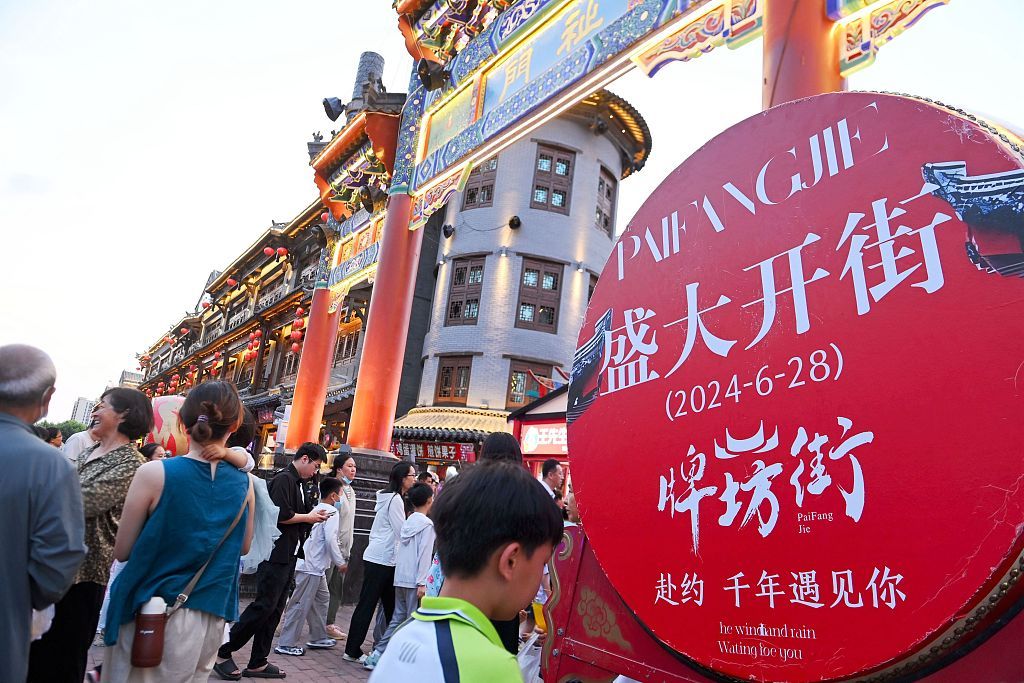 2024年6月28日,青岛西海岸新区牌坊街,市民和游客在休闲度夏。当日,山东青岛首个风雅宋沉浸式古风街区在西海岸新区牌坊街开街,让市民和游客在品尝美食,享受盛夏清凉海风的同时,身临其境感受宋代文化,领略梦华的烟火人间。