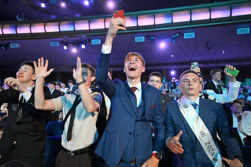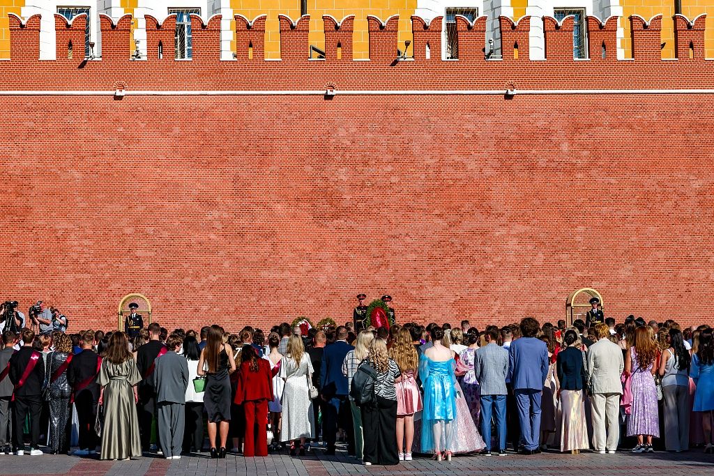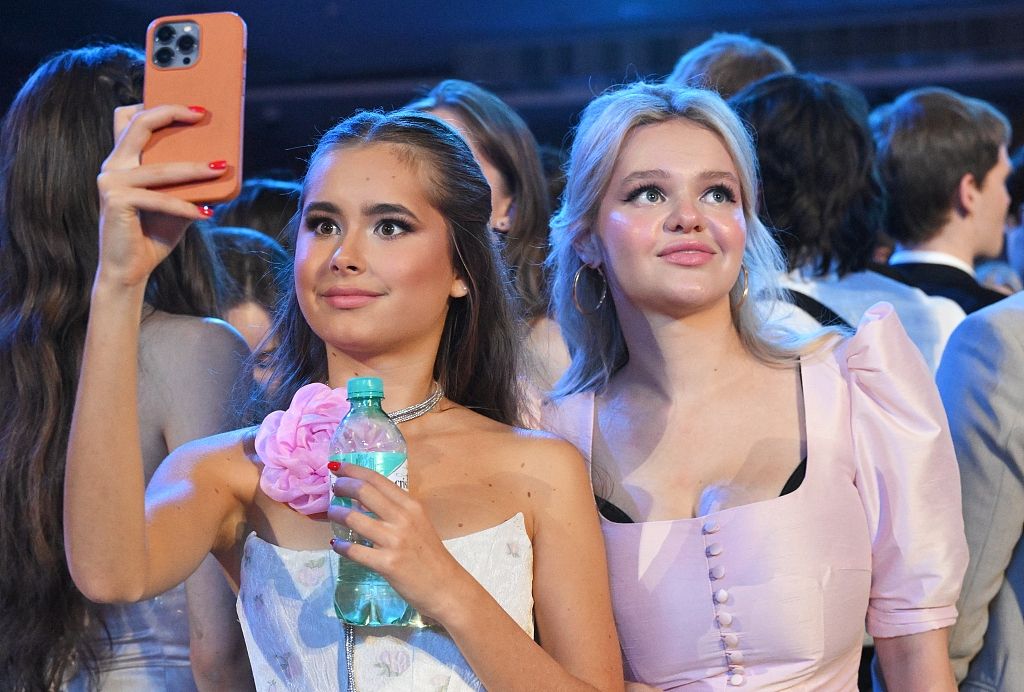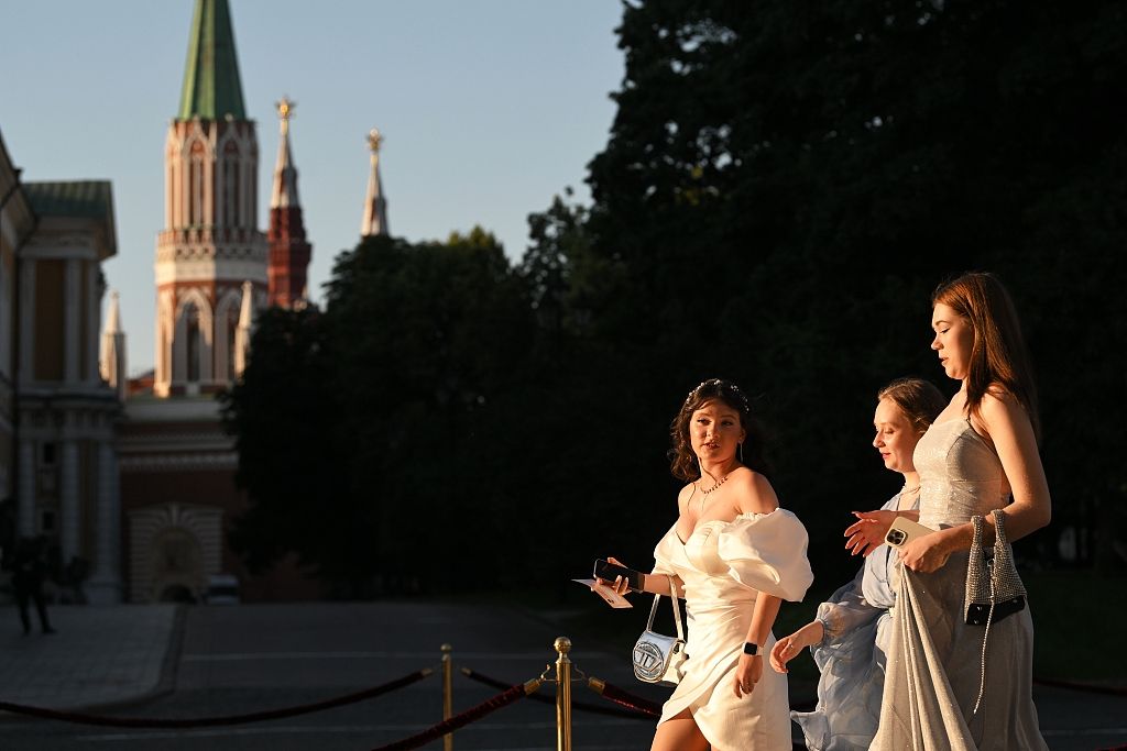当地时间2024年6月28日,俄罗斯莫斯科,年轻人在克里姆林宫为中学毕业生举办的舞会上跳舞。