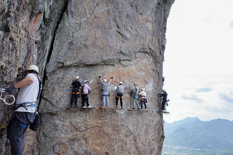 2024年6月29日,浙江温州雁荡山飞拉达景区吸引大批游客体验游玩,享受刺激的攀岩运动。