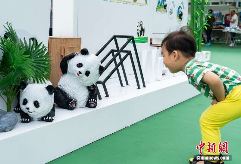香港维多利亚公园“维园庆回归”活动上,一名小朋友俯身观看大熊猫布景。