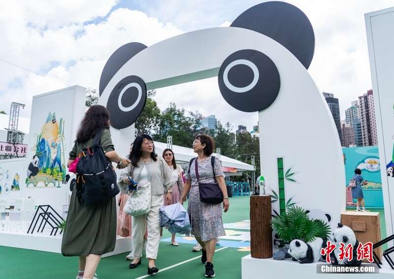 7月1日,市民游客经过香港维多利亚公园“维园庆回归”活动的大熊猫布景。当天,香港特区行政长官李家超宣布,中央政府将再向香港赠送一对大熊猫。
