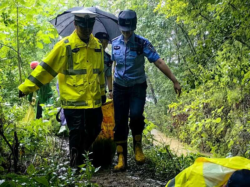 冯静洁立即将此情况向副所长长倪明汇报,倪明随即联系准备防汛物资,并带领冯静洁和辅警张宁、龚世磊、姚文运、李跃东、洪新等10人驱车前往现场。当天暴雨倾注,供通行的只有一条只能容纳一人行走的泥路,稍有不慎就会跌进路旁的山丛里。