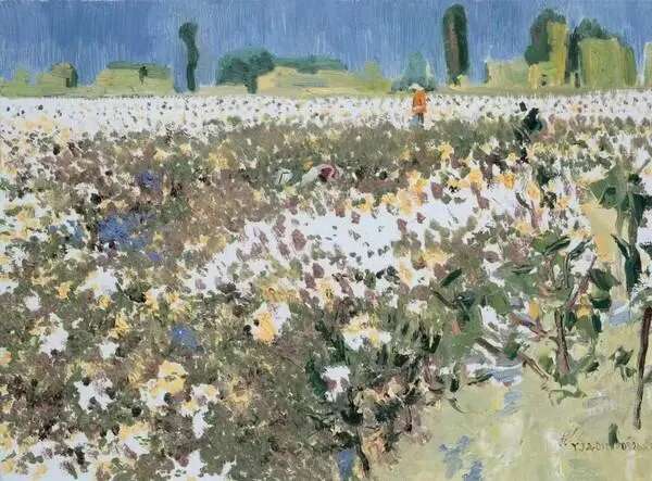 《采棉花》中,女人身后背着一个袋子,俯身下去采棉,画面中流动着丰收的喜悦。《乡韵》表现了晌午的村庄,在强烈的阳光下,点线面、黑白灰,让整个画面呈现跳跃的感觉。