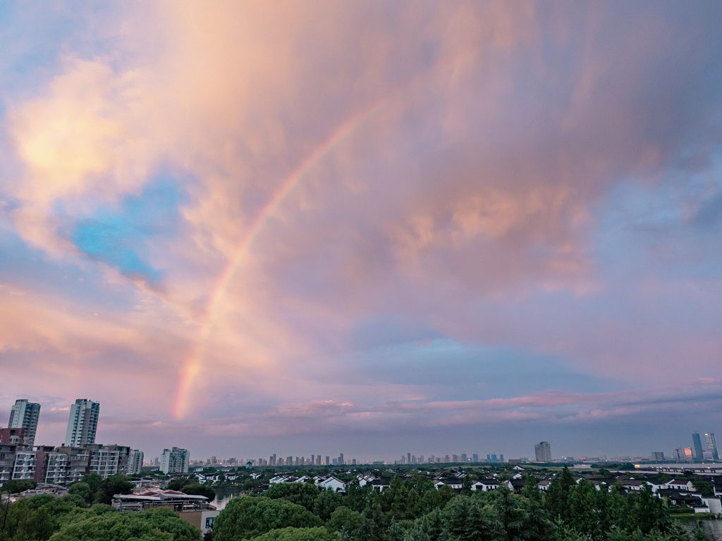 2024年7月2日,苏州,近期的梅雨天气带来大量的雨水,傍晚天空放晴,绚丽的晚霞伴着一道美丽的彩虹,绚烂美丽。