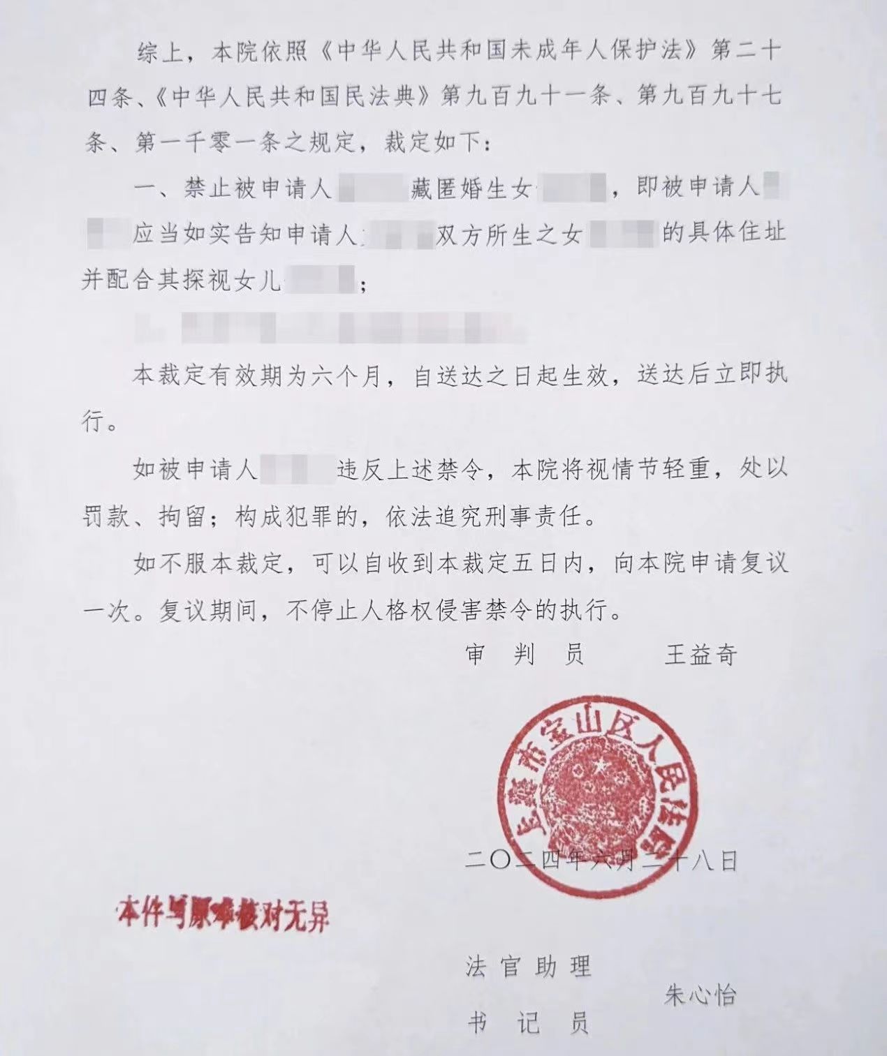 7月3日,澎湃新闻记者从上海市宝山区人民法院(以下简称“上海宝山法院”)获悉,6月28日,该院对这起离婚分居期间藏匿未成年子女的人格权侵害案件,首次尝试发出人格权禁令。