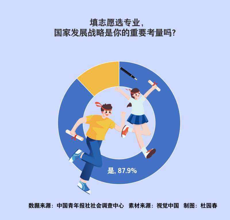 日前,中国青年报社社会调查中心联合问卷网(wenjuan.com),对1333名今年的高考生进行的一项调查显示,填志愿选专业,87.9%的受访考生明确表示国家发展战略是重要考量。