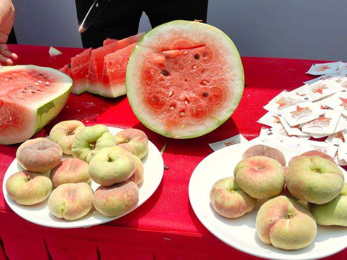 活动现场供市民品尝的蟠桃和西瓜。中新网 张小雨 摄