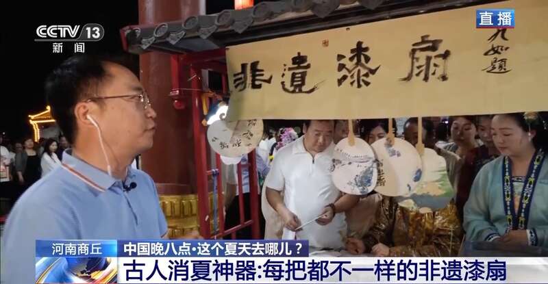 这里还有很多国家级和省级的物质文化遗产,中原地区的古人是最忠于二十四节气的,关于消暑的非遗——漆扇,是以扇子为载体,运用国家级非遗漆染工艺,手工染制而成的艺术品。因为每次渲染的颜色和动作都不一样,出来的每把漆扇也都不一样,有的像是一副泼墨山水画,有的色彩斑斓像是田园美景,各具其韵,独一无二。