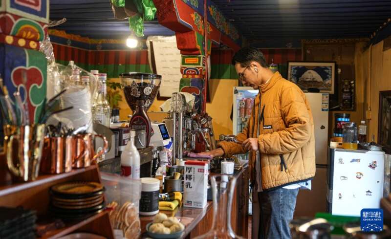 咖啡师扎西多吉在制作咖啡(7月5日摄)。新华社发(格桑雍珍 摄)